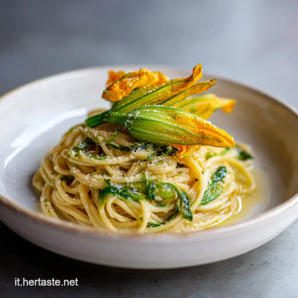 Aggiungi i fiori di zucca solo ora, a fuoco spento. Il calore residuo degli spaghetti li farà appassire appena, mantenendo il loro sapore delicato. Se hai fiori in eccesso, puoi usarli per preparare dei croccanti Fiori di Zucca ricetta come antipasto.