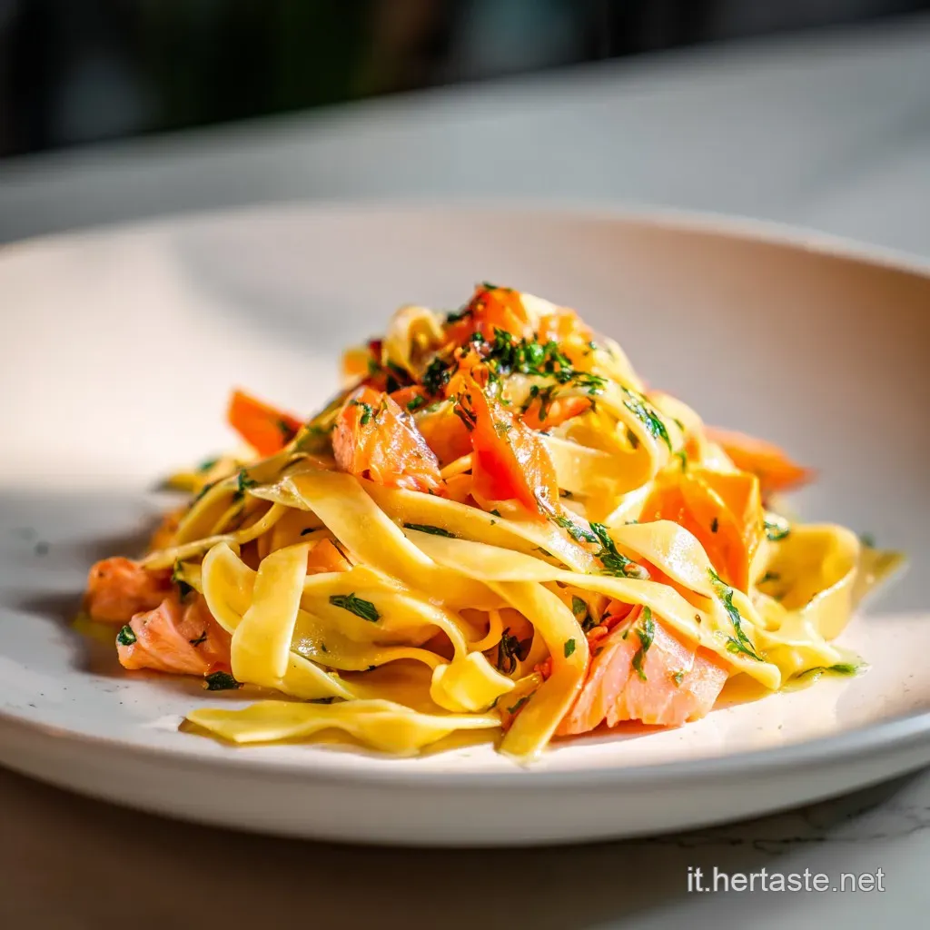 Il segreto per un piatto che sembri professionale è l'altezza. Usa un forchettone e un mestolo per creare un "nido" di tagliatelle al centro del piatto. Posiziona i pezzi di salmone rimasti in cima, quasi come petali di un fiore, per mostrare la qualità dell'ingrediente principale.